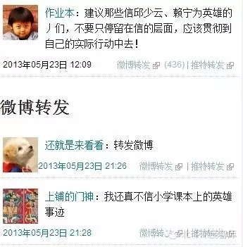 2013年05月23日 01:42 @作业本 新浪微博发布了反人类的攻击邱少云、赖宁的著名微博: