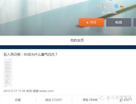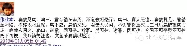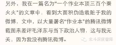 作业本这篇“推卸文”的另一个主题,是对笔者2015年4月17日发在北斗深度智库(微信公共号bdsdzk)的《一个作业本,三百秦火火--“黑死中国”的作业本比“谣翻中国”的秦火火更恶毒》(链接:http://t.cn/RAHJNPS )一文的回应。作业本写道: