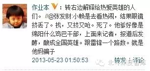 而@作业本则于2013年5月23日01:50:53 发表微博,他转发了张发财的这条恶毒中伤赖宁和雷锋的微博,并写道:【转右边解释给热爱英雄的人们。】