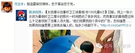 2013-8-2 22:36 新浪视频发表报道,揭露【小女孩为晕倒环卫工撑伞的照片】为造假和商业炒作后,作业本于2013年08月02日 23:29 在新浪微博上发表微博,讽刺雷锋同样是造假:【制造雷锋好榜样,忠于革命忠于党.】