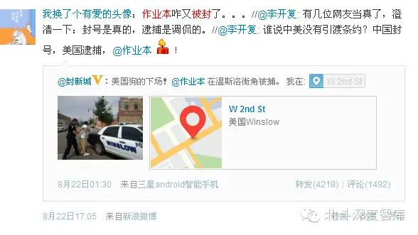 【2013年8月22号,有将近700万粉丝的大V@作业本账号被封,此时作业本还在美国。李开复调侃说“谁说中美没有引渡条约?中国封号,美国逮捕”,后来又补充说:“有几位网友当真了,澄清一下:封号是真的,逮捕是调侃的。”