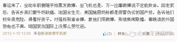 【春运来了,坐动车前要随手拍票发微博,坐飞机也是,万一出事微博说不定能救命.回老家后,告诉乡亲们蒙牛奶致癌,法国合生元、美国施恩奶粉都是假冒伪劣的国产货.告诉他们校车很危险,得看好孩子.对强拆别拿命搏,教他们用微博,别信新闻联播,春晚读的外国贺电也不真,咱国家在国际上没那么受欢迎.】