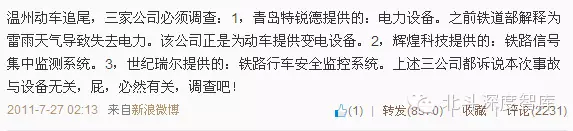 【温州动车追尾,三家公司必须调查:1,青岛特锐德提供的:电力设备.之前铁道部解释为雷雨天气导致失去电力.该公司正是为动车提供变电设备.2,辉煌科技提供的:铁路信号集中监测系统.3,世纪瑞尔提供的:铁路行车安全监控系统.上述三公司都诉说本次事故与设备无关,屁,必然有关,调查吧!】