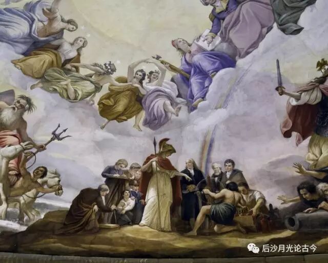构图中:华盛顿身穿象征权力的紫色衣袍,脚踩云霞。边上绕着他的女人,可不是普通人,全是古希腊,古罗马的女神们。直接告诉你一个道理:他是众神之神。