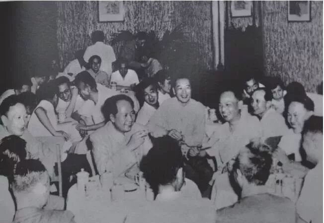 图一:1957年 7月 7日夜,团桌座谈会结束后,毛泽东与 36位各界人士步出会议室,走在前往小剧场观看越剧《追鱼》的大厅通道中。(徐大刚摄)