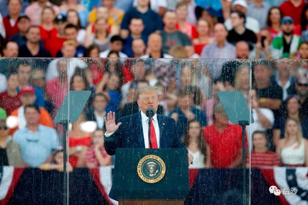 傍晚6点35分左右,特朗普在林肯纪念堂台阶上发表雨中演讲。这也是近几十年来,首次有总统在独立日当天发表正式演讲。