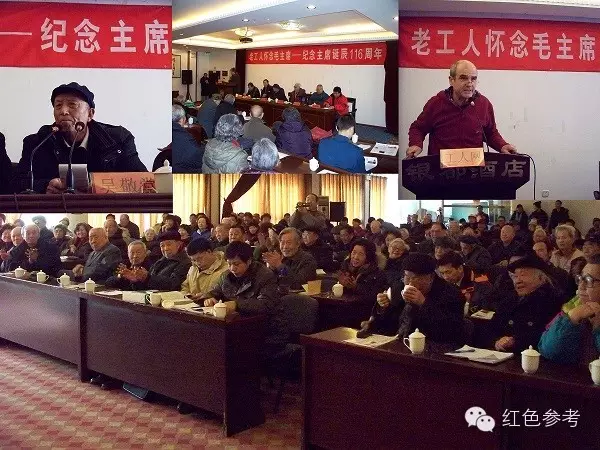 图2:2009年12月26日是毛主席诞辰116周年,中国工人网在北京召开了题为“老工人怀念毛主席”的纪念活动,邀请了七位老工人为200余名与会者讲述自己对毛时代的认识和感受。其中还特意请来了当年爆发通钢事件的工人代表吴敬堂为大家做了报告,阳和平为大家讲述了自己分别在毛时代和美国当工人的不同感受,为人们留下了深刻的记忆。