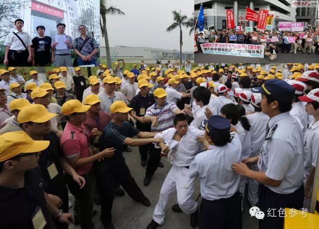 图4:2010年5月27日,位于广东佛山的本田汽车零部件厂发生罢工要求提升工资,结果引起在中国的所有本田零配件厂瘫痪,进而本田整车装配停产。由于本田辞退了两名罢工者,并拒绝按工人的要求加薪,当地工会派员(戴黄帽者)前去迫使工人复工,从而引起肢体冲突。6月3日中国工人研究网发起百余名各界人士签名声援活动,6月8日网站即被以“发布导向不良文章”为由勒令关闭。7月1日党建日,中国工人研究网的四位编辑前往全总递交《呼吁中华全国总工会为工人说话办事》的呼吁书(图左上角)。7月7日,日本三个左翼社团到本田早东京的总部抗议,声援中国工人(图右上角)。其中,国际劳工团结委员会多罗-千叶分部的山本先生,也是6月3日由中国工人研究网及百名各界人士联署声援本田罢工的签署人之一。