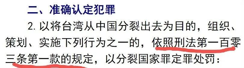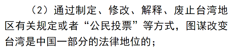 现在我们再来看《意见》的第2条中的第2小条:通过制定、修改、解释、废止台湾地区有关规定或者“公民投票”等方式,图谋改变台湾是中国一部分的法律地位的。