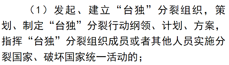 第2条里面的第2小条的内容为:通过制定、修改、解释、废止台湾地区有关规定或者“公民投票”等方式,图谋改变台湾是中国一部分的法律地位的;