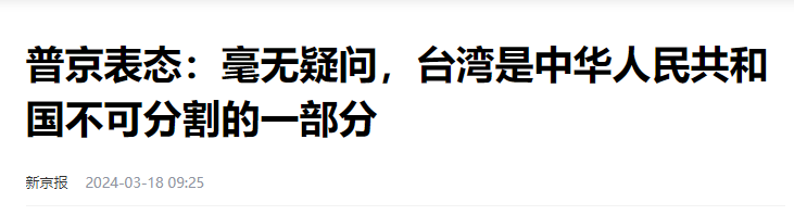 普京就很“上道”,以前他和其它国家一样,也经常说“俄罗斯承认台湾是中国的一部分”,但是现在他改成了“俄罗斯承认台湾是中华人民共和国的一部分”。
