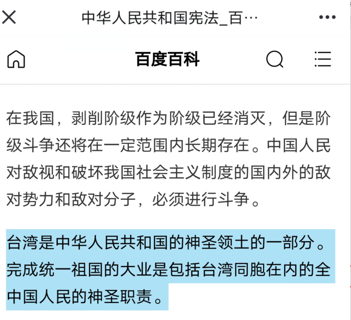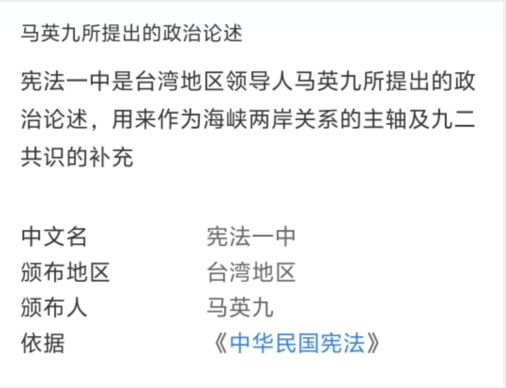 这个我们以前和大家说过,所谓的“宪法一中”就是指:台湾的宪法中规定,世界上只有一个中国,台湾和大陆都是中国的一部分。