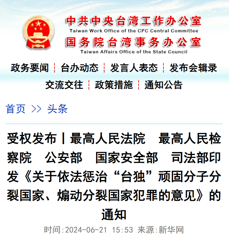 6月21日,最高人民法院、最高人民检察院、公安部、国家安全部、司法部联合发布《关于依法惩治“台独”顽固分子分裂国家、煽动分裂国家犯罪的意见》,自发布之日起施行。