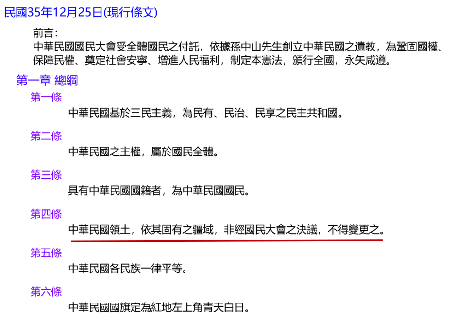 大家看看,1946年时候的中华民国宪法和现在台湾的中华民国宪法在“总纲”部分是不是一模一样的?所以,1946年《中华民国宪法》中的“固有之疆域”和2006年台湾实行的《中华民国宪法》中的“固有之疆域”是相同的意思。